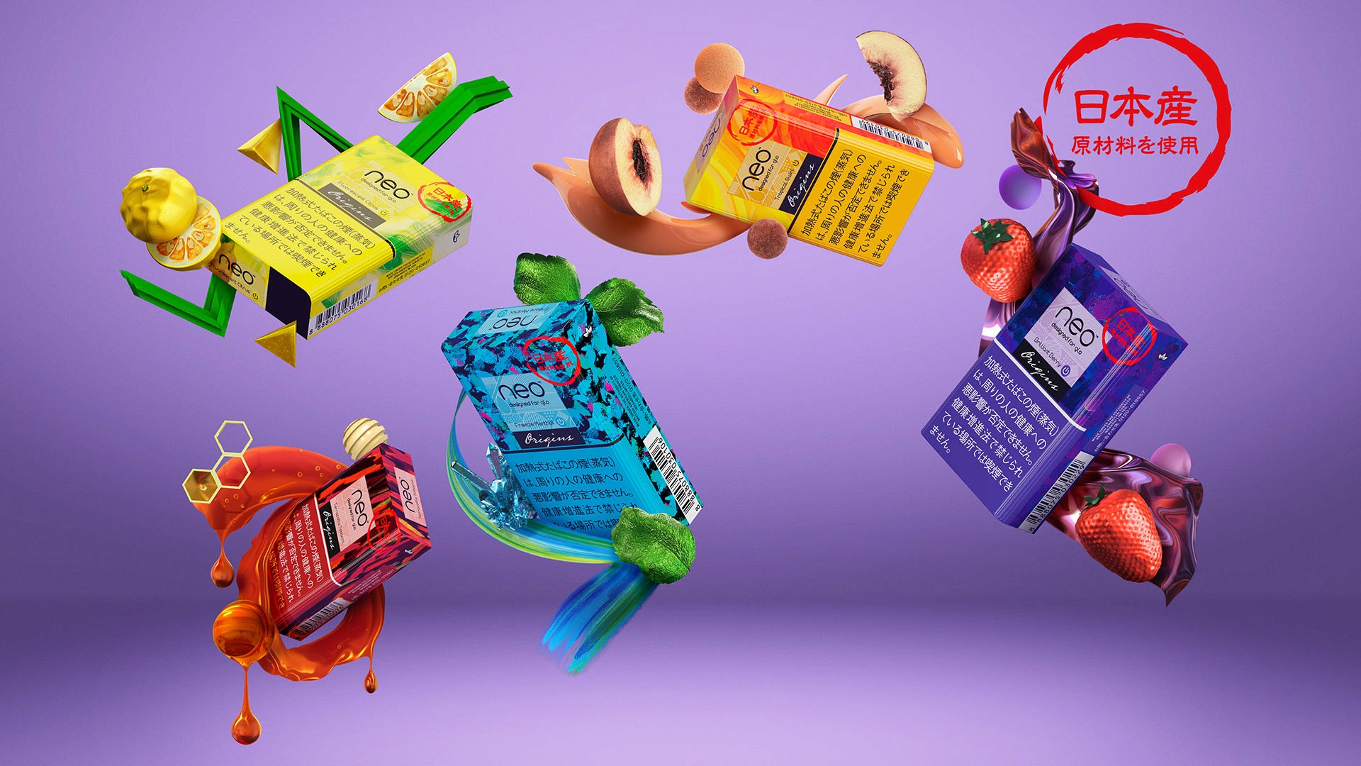 In collaboration with illustration agency Shotopop, we developed a suite of CGI flavor components and a flexible toolkit of assets to promote the new Japanese-inspired range.