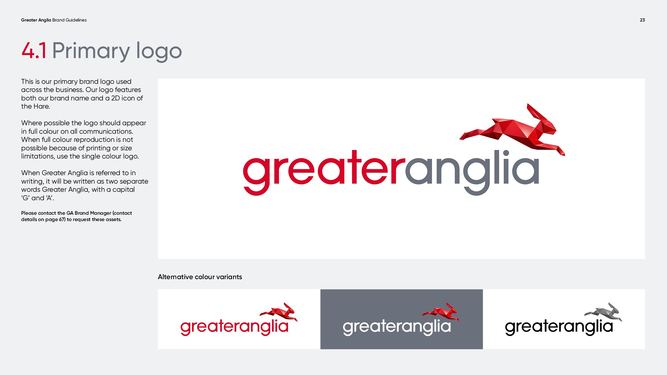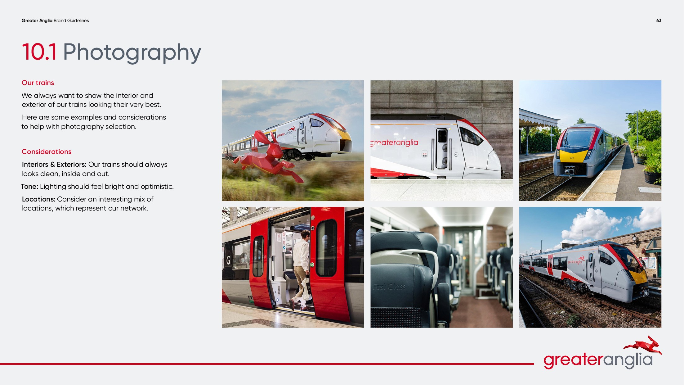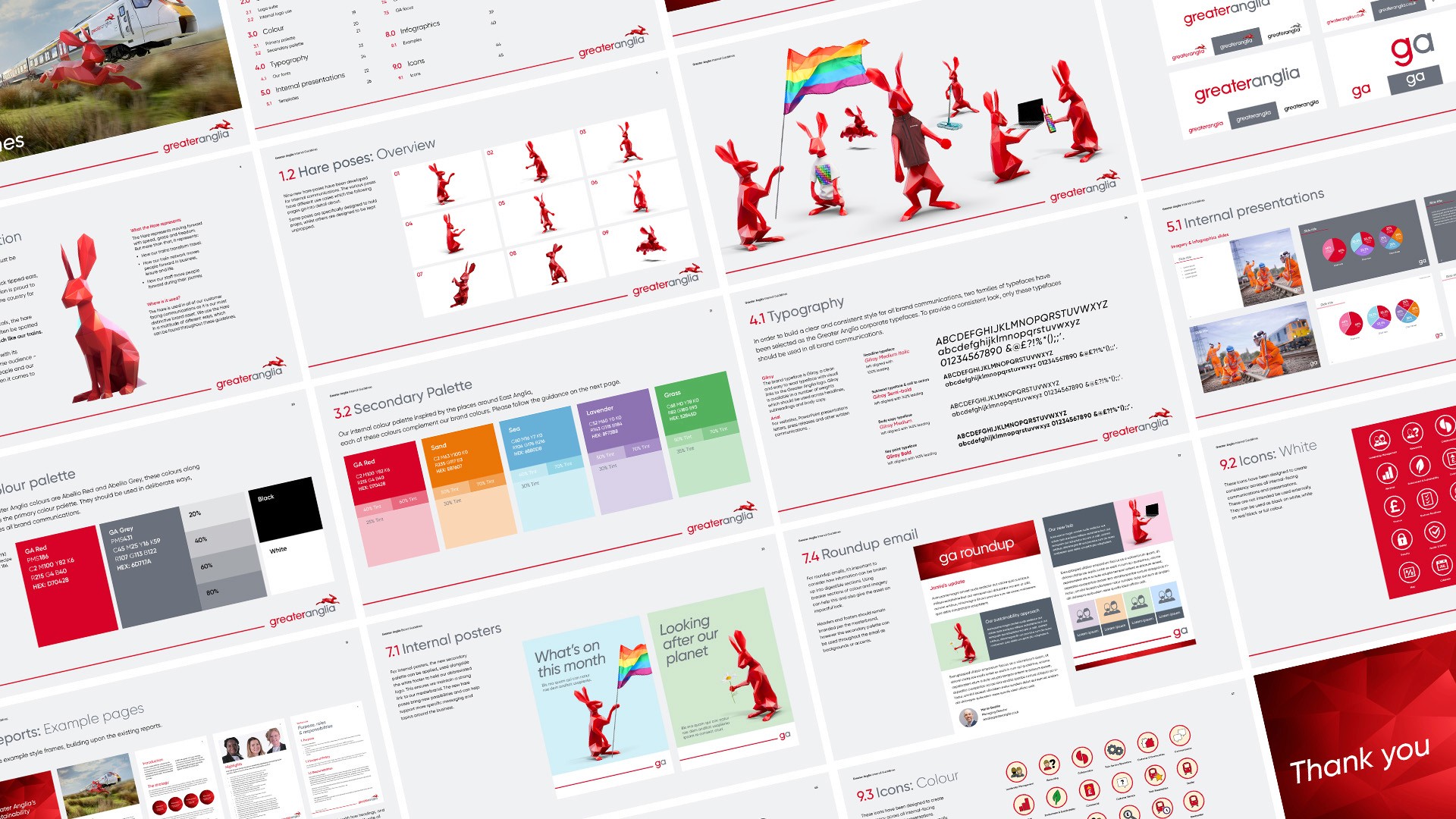 Throughout my time working on Greater Anglia I have refreshed the master brand guidelines, moving them on to allow for greater creative flexibility without losing consistency across the brand’s building blocks. Following the success of this project, I was briefed to develop a set of internal guidelines for the team at Greater Anglia. They needed something fresh and exciting to cut through internally, as well as new assets to reflect their new identity. We developed a suite of new brand Hare assets, which not only work flexibly for the internal teams, but allows Greater Anglia to be mindful of cost.